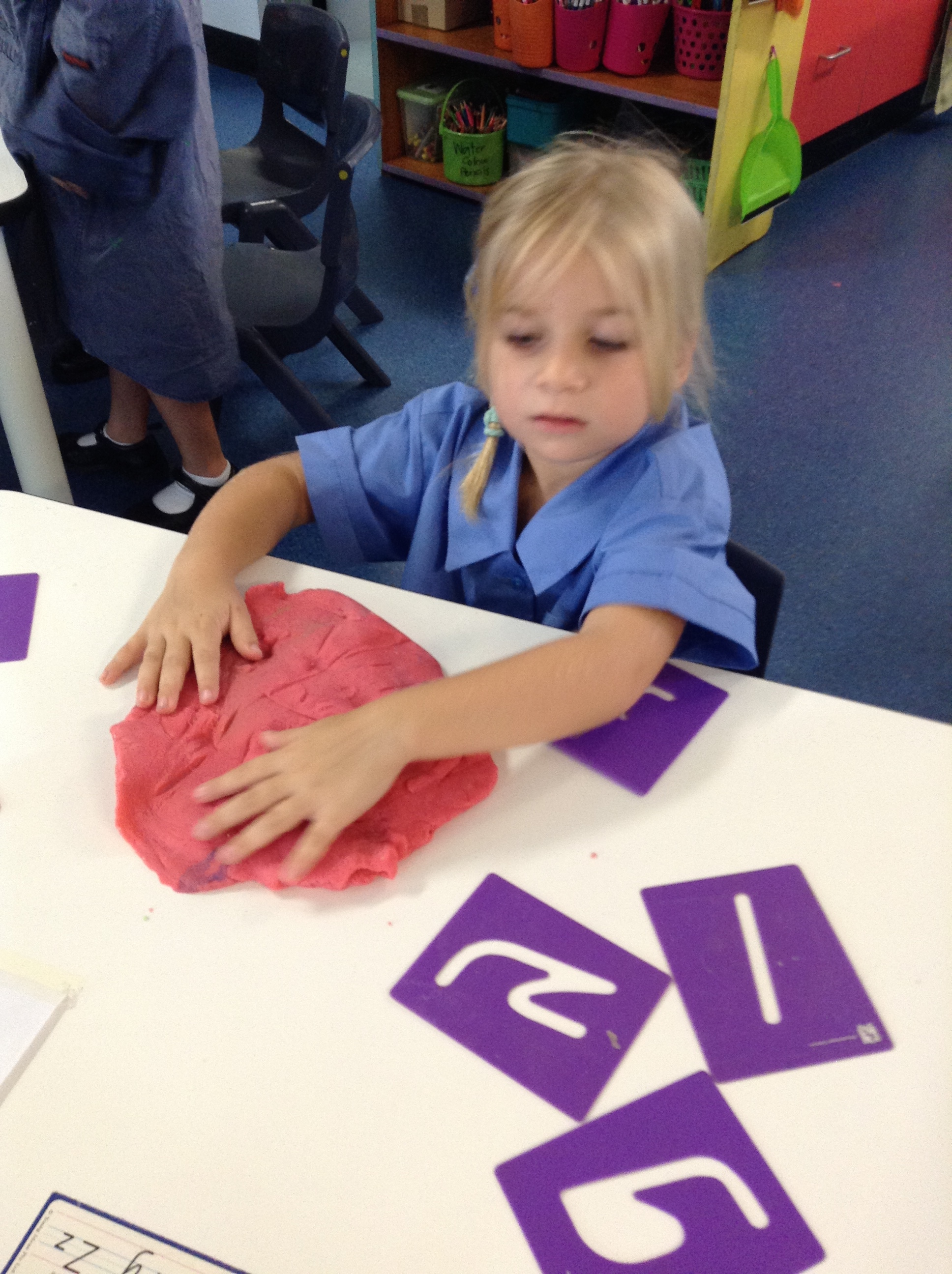 - Stephanie using stencils to make letters in her playdough