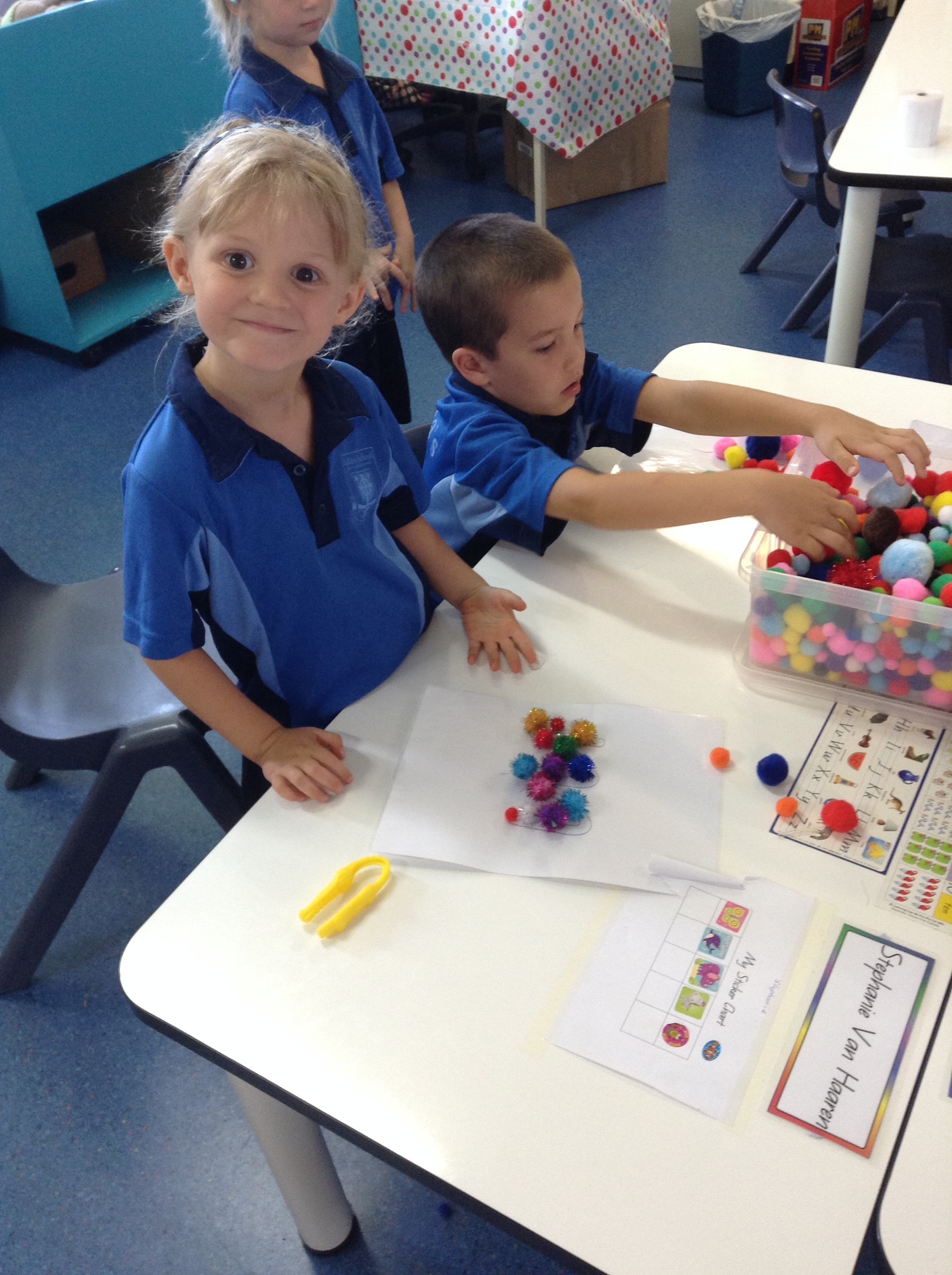 - Neena using tweeezrs to put pom poms on the letter “m”